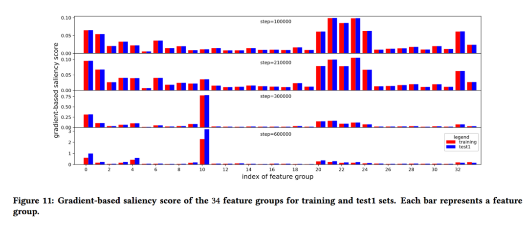 最后,通过梯度信息来分析各个特征组对模型的影响。对于给定的模型,将全连接网络的输入针对模型输出(PCTR)求导,该梯度的强度表示了模型的输出预估对于该输入的微小变动的敏感度,从而可以反映出该输入对于模型的影响力。梯度越大,表明该输入的对模型的影响越大。