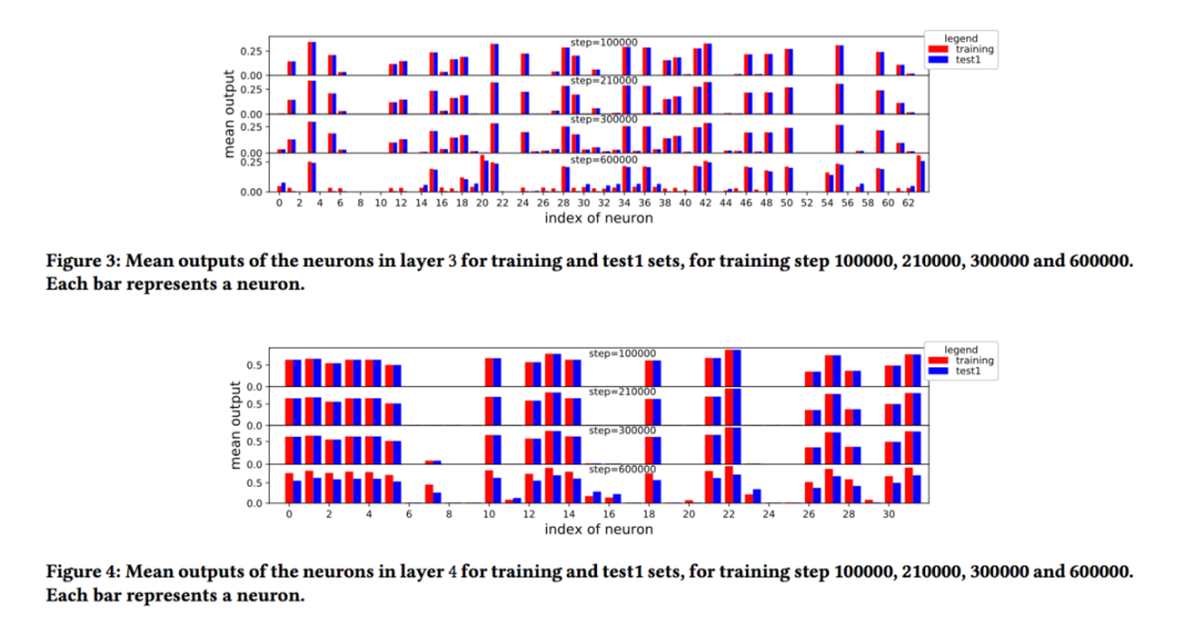 从上面两幅图来看,在欠拟合的第100000步和拟合最好的210000步,两层神经元的输出均值和标准差都非常接近。但随着模型的过拟合,在第300000步二者出现了一定的差异,并且在600000步更加明显。
