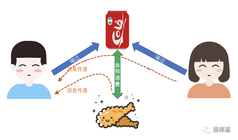 因为“可口可乐”与“炸鸡”经常一起消费,所以“炸鸡”的信息也能够传递到小明身上。