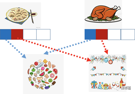 但是,如果我们根据业务知识,将概念拆解,如上图所示。两个特征向量的第一位表示“是否是食物”,从这个角度来看,饺子、火鸡非常相似;两个特征的第二位是“是否和节日相关”,从这个角度来看,饺子、火鸡也非常相似。