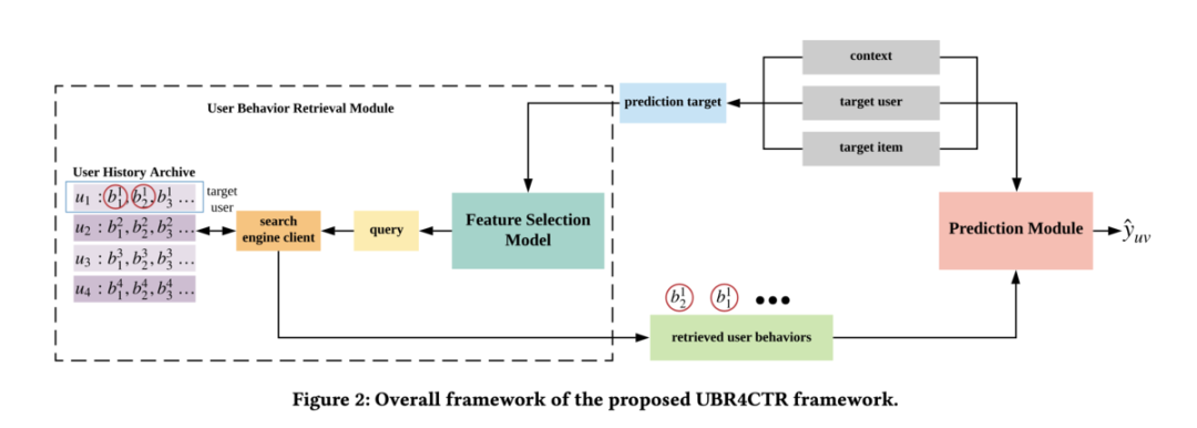 可以看到,UBR4CTR主要分为用户行为检索模块(user behavior retrieval module)和预测模块(prediction module)。用户行为检索模块又包括特征选择模块(feature selection model)、检索引擎(search engine client)和用户行为档案(user history archive)。