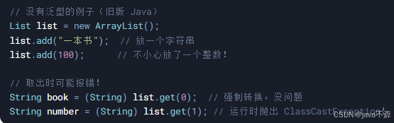 泛型就相当于给代码贴标签。有泛型之前,集合、数组里什么类型的数据都能装,但是在取出时要面临类型转换的问题,容易出错,比如存进去一个字符串“小狗”,又存一个整数200,按索引取数据时对应数据的类型容易填错导致报错。