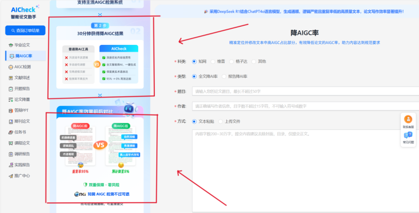 - 支持"全文降AI率"和"报告降AI率"双模式