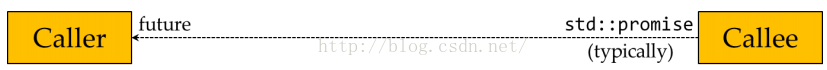 这个线程句柄的行为值得我们一探究竟。future是一个通信通道的一端,负责为被调用者传递运行结果给调用者,我们就从这个角色开始。被调用者(异步执行,延迟任务除外)将运行结果写入通信通道(通常通过std::promise对象),然后调用者通过future对象来读取这个结果。你可以认为这是一个如下所示的过程,其中虚箭头表示信息是从被调用者流向调用者的: