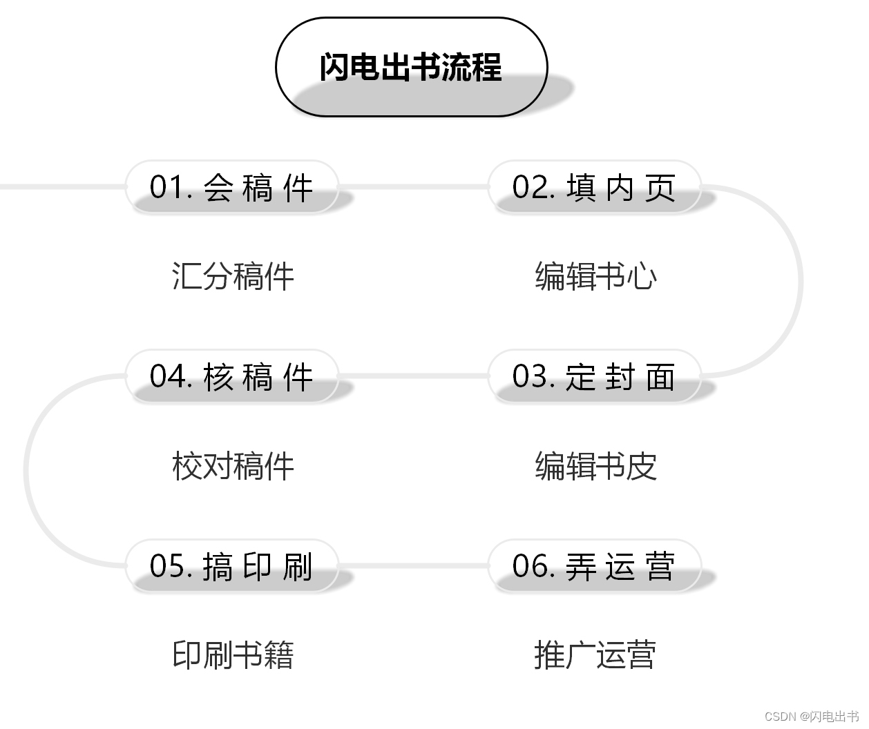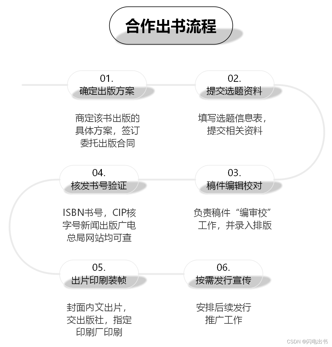 闪电出书流程非常简单,一共六个步骤,分别是: