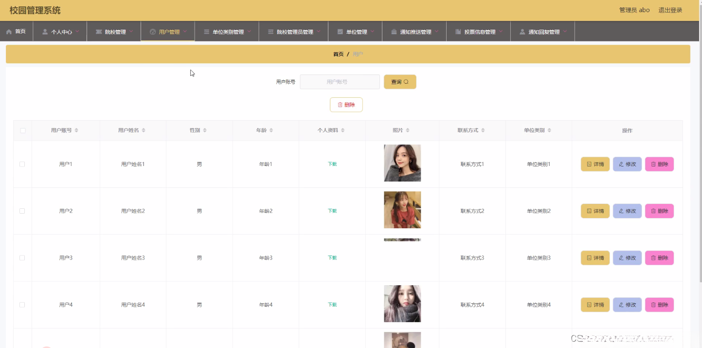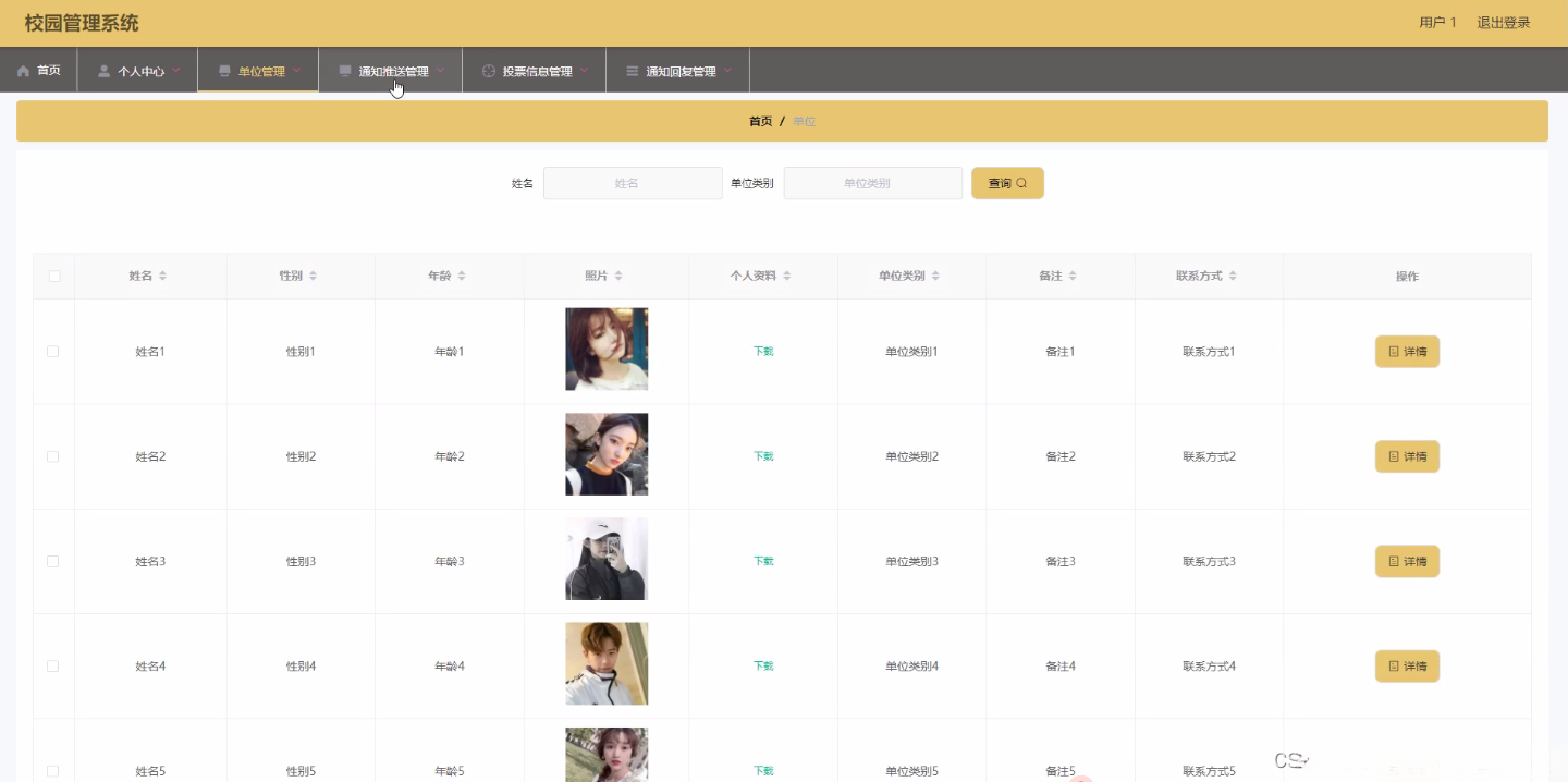 单位管理,在单位管理页面中可以查看姓名、性别、年龄、照片、个人资料、单位类别、备注、联系方式等信息内容,并且根据需要对单位管理进行详情等其他详细操作。