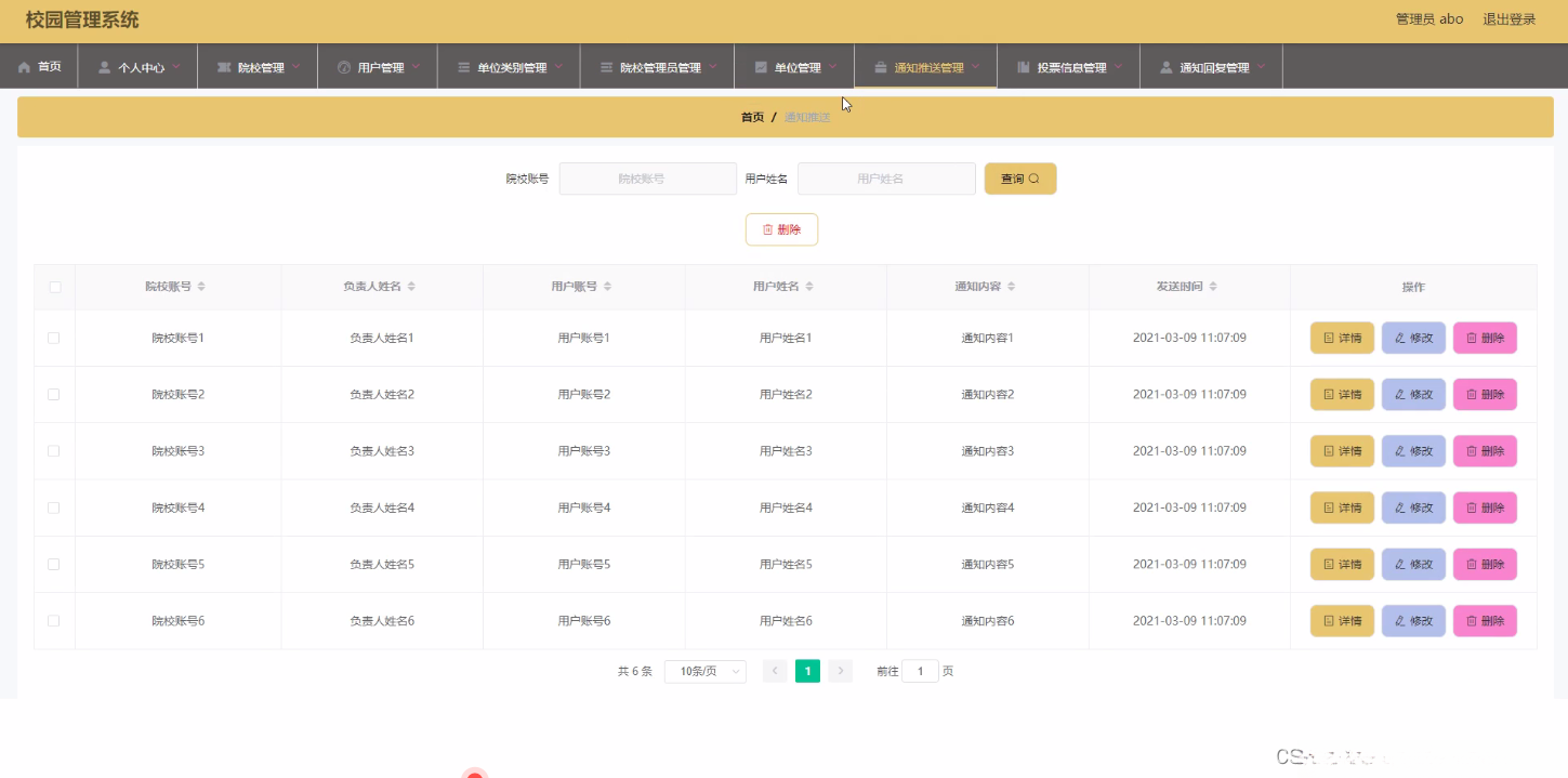 通知推送管理,在通知推送管理页面中可以填写院校账号、负责人姓名、用户账号、用户姓名、通知内容、发送时间等信息,并且根据需要对通知推送管理进行详情、修改或删除等详细操作。