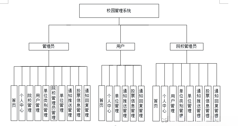 管理员登录进入校园管理系统可以查看首页、个人中心、院校管理、用户管理、单位类别管理、院校管理员管理、单位管理、通知推送管理、投票信息管理、通知回复管理等信息。