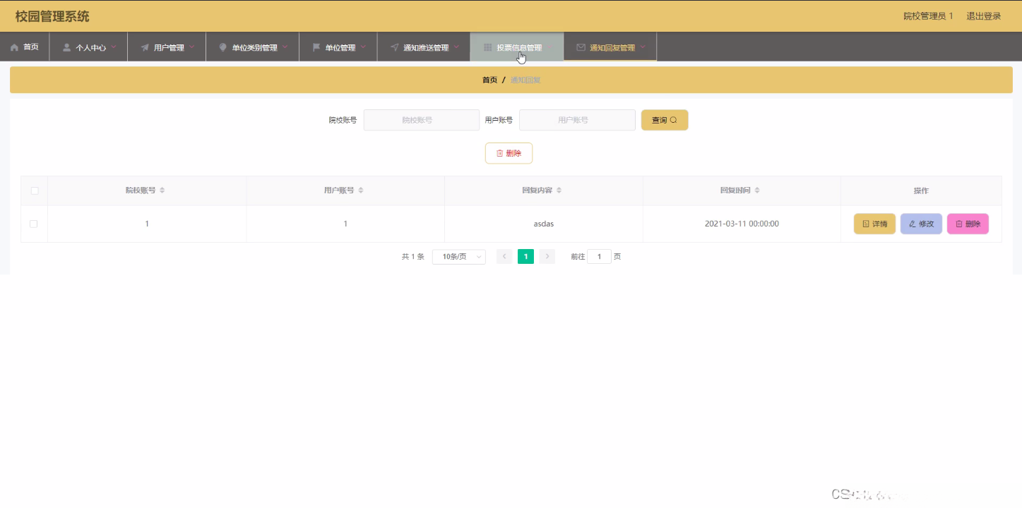 通知回复管理,在通知回复管理页面中通过填写院校账号、用户账号、回复内容、回复时间等内容进行详情、修改、删除等操作。