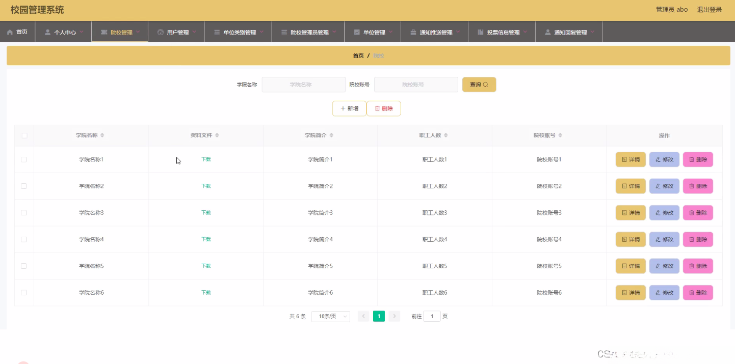 院校管理,在院校管理页面中可以通过填写学院名称、资料文件、学院简介、职工人数、院校账号等信息进行详情、修改、删除等操作。还可以根据需要对用户管理进行详情、修改或删除等详细操作。