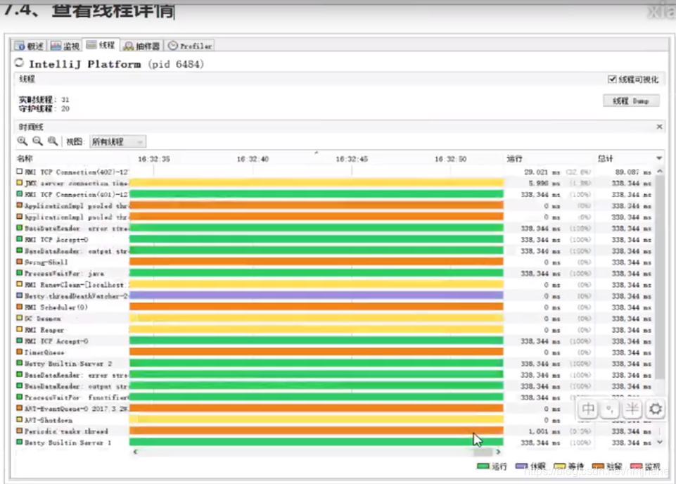 - 性能分析。CPU分析(各个方法调用时间,检查哪些方法耗时多),内存分析(各类