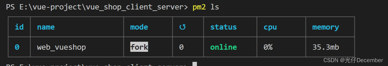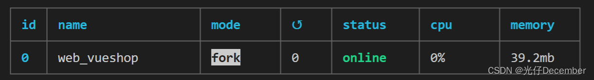 该表格显示我们当前服务器上运行了一个项目,名称为“web_vueshop”,模式是“fork”,状态是在线,还显示cpu占用率以及内存的占用率。
