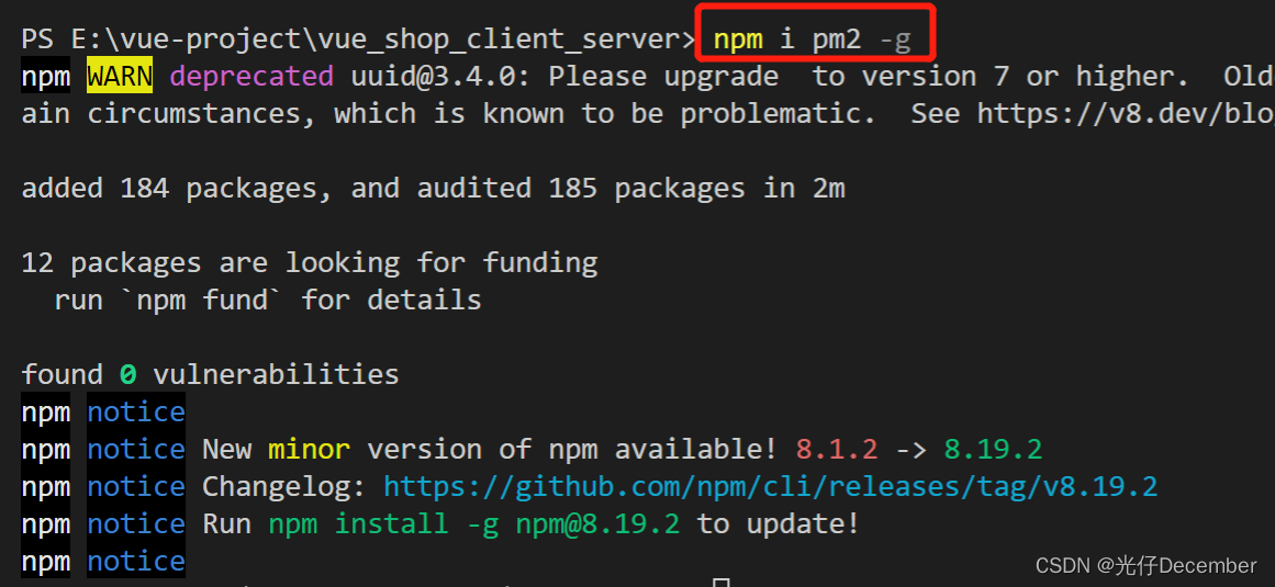 首先我们需要在服务器安装pm2,使用"npm i pm2 -g"指令全局安装: