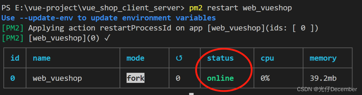 我们还可以通过“pm2 restart 服务名”来进行项目的重启(这里最后跟上我们前面自定义的服务名即可):