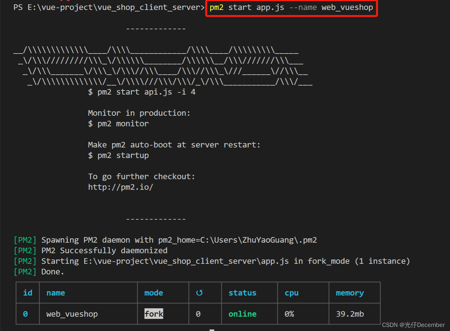 当程序安装完毕之后,使用“pm2 start .\app.js --name web_vueshop”启动项目:
