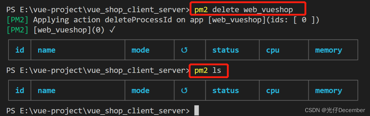 我们还可以通过“pm2 delete 服务名”来删除项目后台服务: