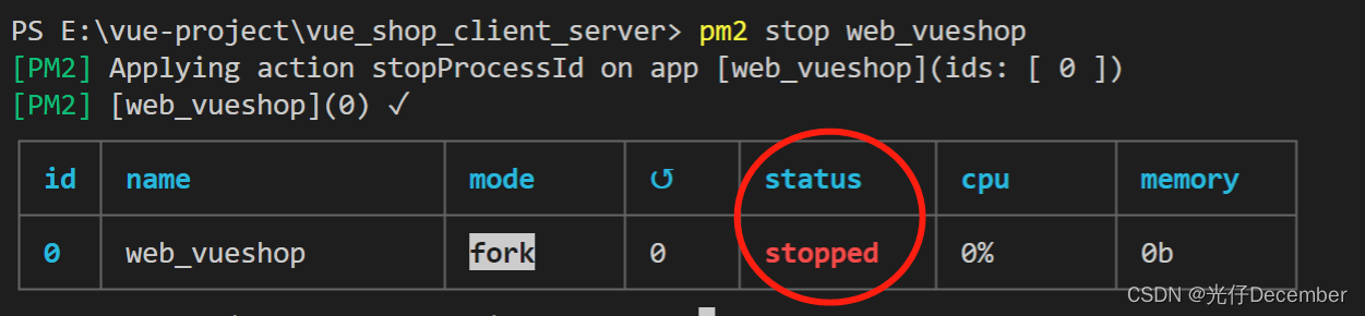 我们还可以通过“pm2 stop 服务名”来停止项目后台服务的运行: