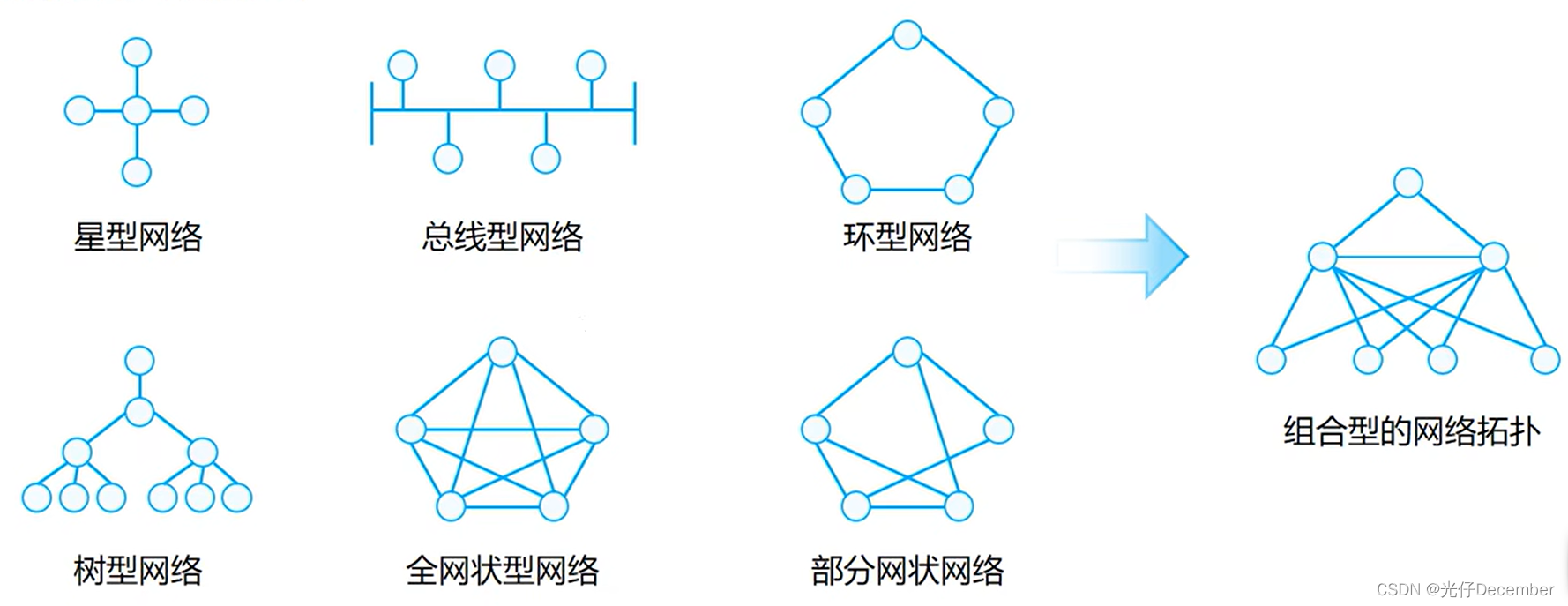 按照网络的拓扑形态来划分,网络可分为星形网络、总线型网络、环形网络、树形网络、全网状网络和部分网状网络: