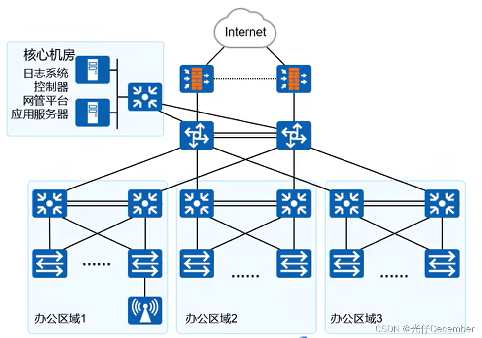 由路由器、交换机、防火墙、无线控制器、无线接入点,以及个人电脑、网络打印机、服务器等设备构成的通信网络。