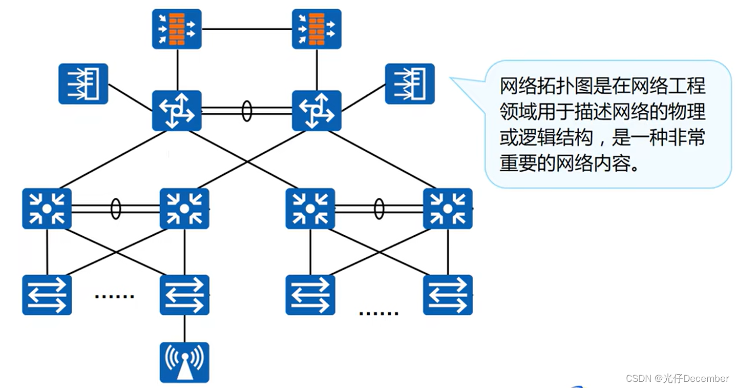 什么是网络拓扑?网络拓扑(Network Topology)是指用传输介质(例如双绞线、光纤等)互联各种设备(例如计算机终端、路由器、交换机等)所呈现的结构化布局,如下就是一个网络拓扑结构: