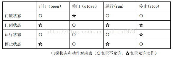 继续运行和开门动作;我们用一张表来表示电梯状态和动作之间的关系: