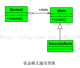 上面例子中多次提到状态,那我们这节讲的就是状态模式,什么是状态模式呢?当一个对象内在状态改变时允许其改变行为,这个对象看起来像是改变了其类。说实话,这个定义的后半句我也没看懂,看过GOF 才明白是怎么回事: Allow an object to alter its behavior when its internal state changes. Theobject will appear to change its class. [GoF, p305],也就是说状态模式封装的非常好,状态的变更引起了行为的变更,从外部看起来就好像这个对象对应的类发生了改变一样。状态模式的通用实现类如下: