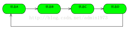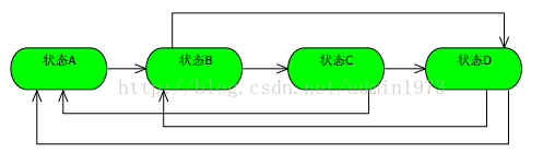 上面的例子可能比较复杂,请各位看官耐心的看,看完我想肯定有所收获。我翻遍了所有能找的到的资料(至少也有十几本,其中有几本原文的书还是很的很不错的,我举这个电梯的例子也是从《DesignPattern for Dummies》这本书来激发出来的),基本(基本哦,还是有几本讲的不错)上没有一本把这个状态模式讲透彻的,我不敢说我就讲的透彻,大家都只讲了一个状态到另一个状态过渡,状态间的过渡是固定的,举个简单的例子: