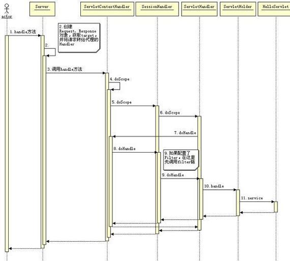 上图可以看出 Jetty 处理请求的过程就是 Handler 链上 handle 方法的执行过程,在这里需要解释的一点是 ScopeHandler 的处理规则,ServletContextHandler、SessionHandler 和 ServletHandler 都继承了 ScopeHandler,那么这三个类组成一个 Handler 链,它们的执行规则是:ServletContextHandler.handleServletContextHandler.doScope SessionHandler. doScopeServletHandler. doScopeServletContextHandler. doHandleSessionHandler. doHandleServletHandler. doHandle,它这种机制使得我们可以在 doScope 做一些额外工作。
