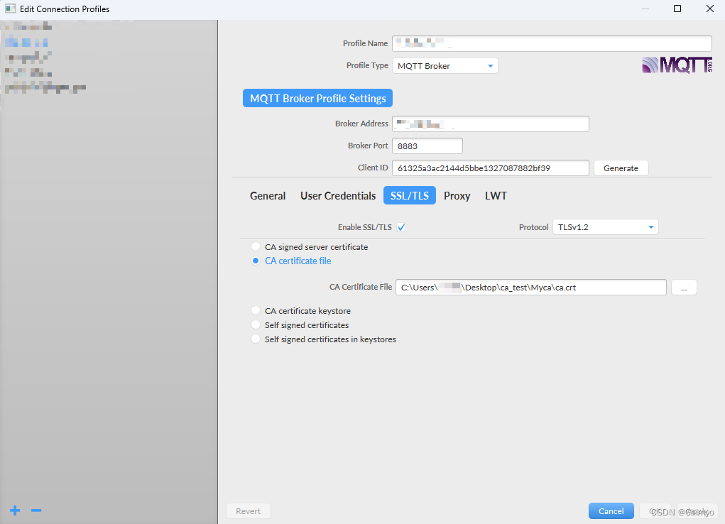 Ubuntu下MQTT部署及TLS配置 MQTT协议如果不做配置,其数据在网络传输中是明文传输的,就算配置了账号密码也可以被抓包软件直接获取到。(也可以在/etc/mosquitto/conf.d中单独另写一个,把CA的配置拆分出来)(也可以在/etc/mosquitto/conf.d中单独另写一个,把CA的配置拆分出来)将CA证书以及生成的client证书和key文件填入,登录测试即可。CA证书的获取按照自己的网站来获取。将服务器的CA文件放在一个指定目录中,然后修改。将服务器的CA文件放在一个指定目录中,然后修改。将路径指向CA证书即可。