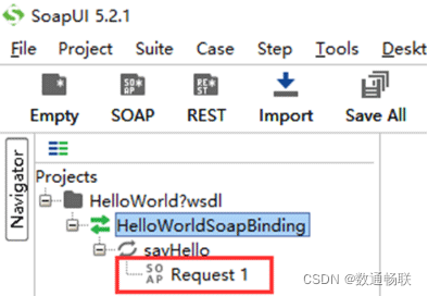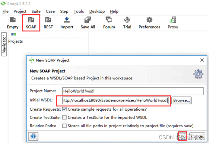 到SoapUI中选择Soap,将地址粘贴到对应位置,会自动生成工程的名称,点击OK。