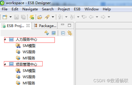 在ESB设计器中创建两个应用,将“人力服务中心”作为原工程,“项目管理中心”作为目标工程,创建完成之后部署两个应用。