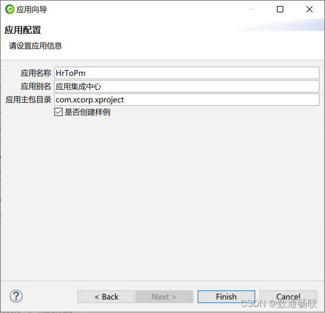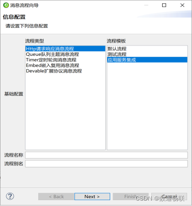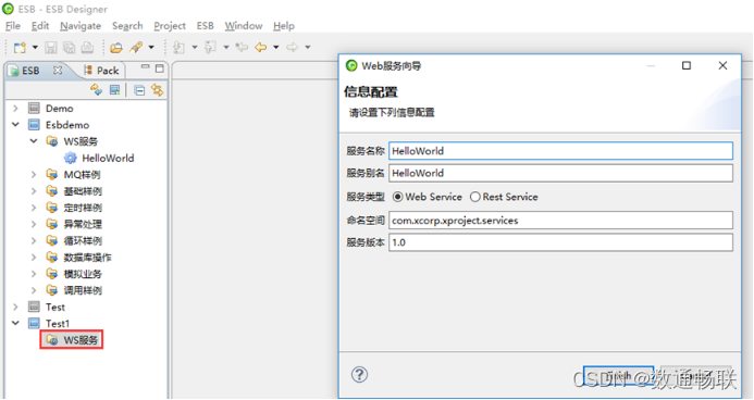打开ESB设计器后,可以通过“File”中的“new”去创建ESB项目,在弹出的“基本配置”页面中点击“测试连接”按钮(不需要修改信息),即可点“Next”进入“应用配置”页面,“是否创建样例”可自选是否勾选,勾选后会创建ESB设计器预置的样例,不勾选则无,点击“FInish”即可完成创建。