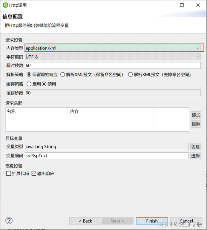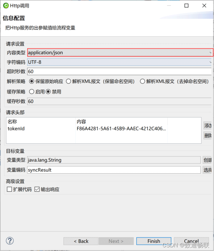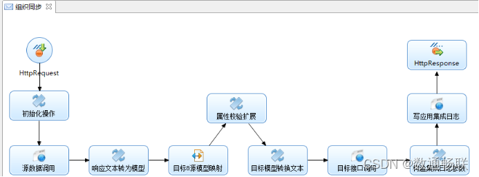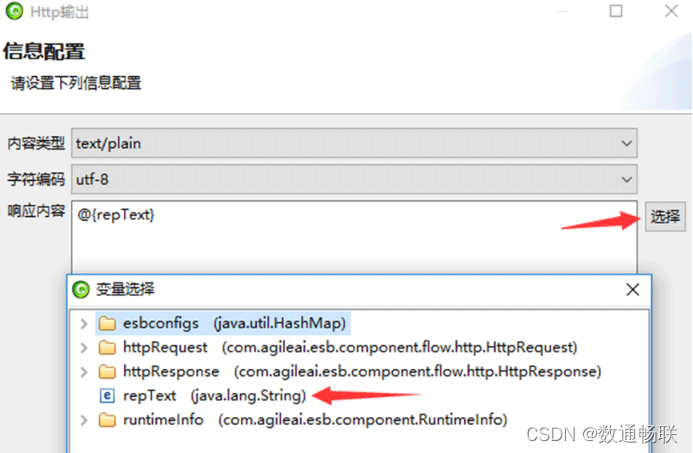 “数据转换”节点配置的功能时将传入的参数“param”封装到“repText”中;双击“HttpRequest”节点,配置响应内容,如图:
