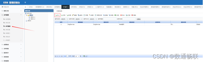 服务分组功能是定义服务中心左侧显示的分组树, 服务中心功能是将各个系统服务在ESB进行管理的功能, 场景配置功能是将已注册的系统间接口进行对接, 流程日志用于记录业务集成时,流程的执行情况,支持根据日期、流程名称、流程编码、类型等多种形式的查询功能,以及失败后的重发功能。