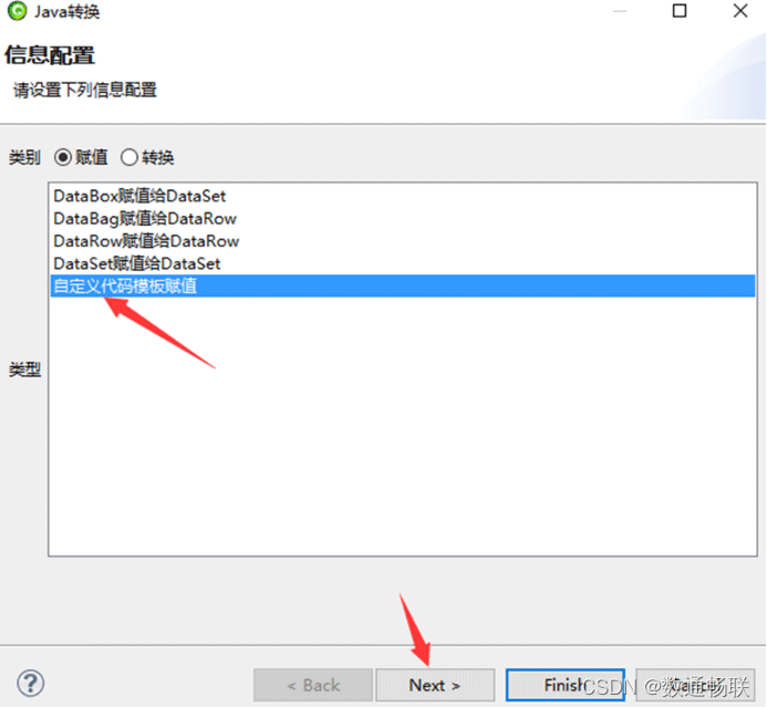 双击“数据转换”节点,选择“赋值”类别中的“自定义代码模板赋值”,点击“Next”,如下图:
