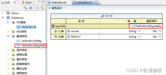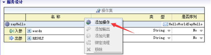 右键点击“添加操作”,填写操作名称sayHello,入参words、出参RESULT设置对应的类型,如下图: