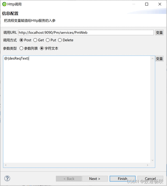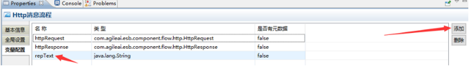 双击“HttpRequest”节点,添加参数param;点击空白处,在“Properties”栏中会显示出流程的信息,点击变量配置,添加变量“repText”并设置对应的类型,如下图: