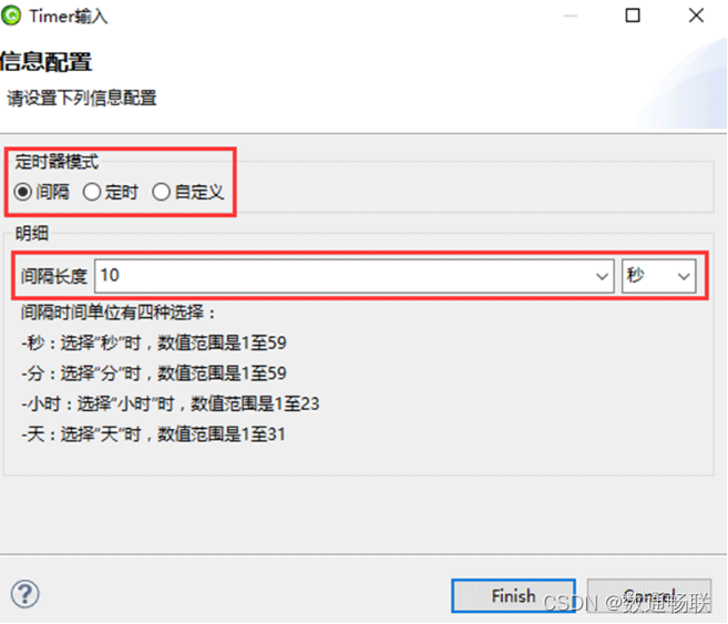 双击“TimerRequest”节点,可以选择间隔、定时、自定义。选择对应的时长以及时长的单位点击Finish按钮,如下图: