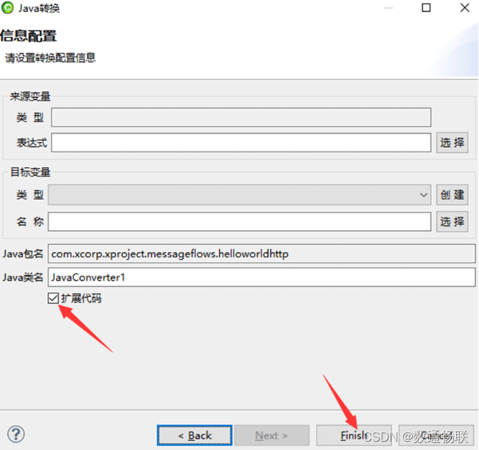 跳转到“信息配置”页面,本流程需要通过扩展代码转换变量故不填写“来源变量”和“目标变量”,如图:
