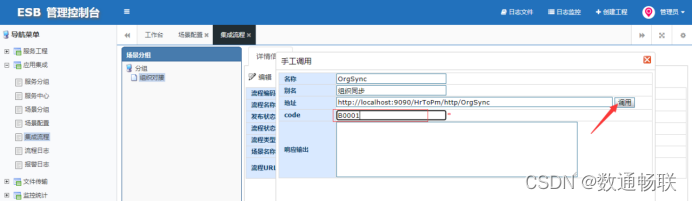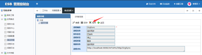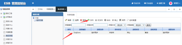 到ESB控制台,在“集成流程”模块可以看到之前部署的组织同步流程,选择该流程,点击“发布”。