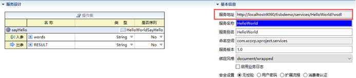 样例用于建立WebService服务,样例为HelloWorld。本WebService服务里面只有一个操作sayHello,与HelloWorldSayHello子流程绑定。通过向浏览器传入words参数,执行子流程的业务。服务地址在右侧,可以通过它来定位本WebService服务。
