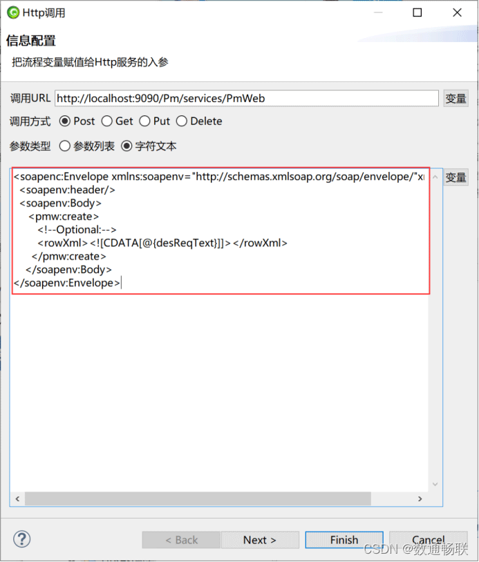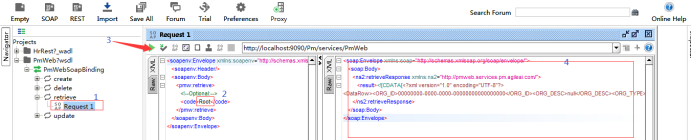 点击调用参数,到SoapUI中复制刚刚运行PmWeb服务生成的信息中“<![CDATA[ ]]>”中的信息。