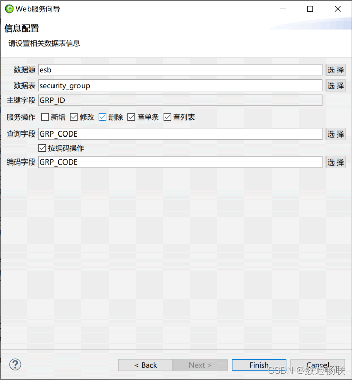 在配置中选择security_group表选择查列表,查询字段为编码字段,按照编码操作,编码字段也选择为CODE。