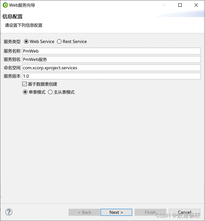 右键项目管理中心的WS服务,创建Web Service服务,勾选“基于数据表创建”,选择“单标模式”,之后点击next,如图所示: