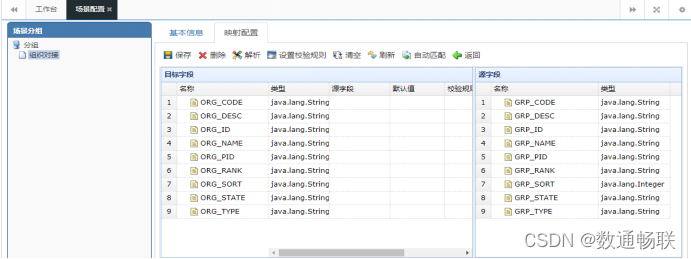 基本信息配置完成后点击“保存”按钮,然后到映射配置模块,点击“解析”按钮,左边为目标字段,右边为源字段,选择对应的名称,然后双击源字段,即可将数据存储到目标字段中。