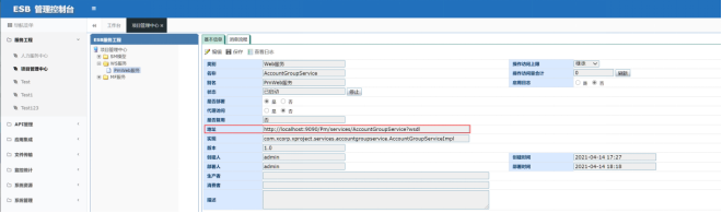 到ESB管理控制台服务工程模块中,找到对应的工程,复制服务的地址,然后到SoapUI中测试对应的功能是否能正常运行。