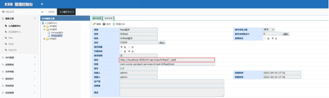 到ESB管理控制台,在“服务工程”中复制HRRest服务的地址。