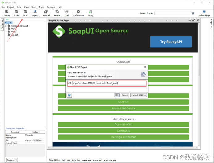 打开SoapUI软件,点击“SOAP”按钮,将之前复制的地址粘贴到弹出框的Initial WSDL框中,点击“OK”完成,如下图: