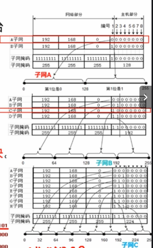 子网C:借3位,掩码:255.255.255.224 主机为192.168.0.193~192.168.0.222