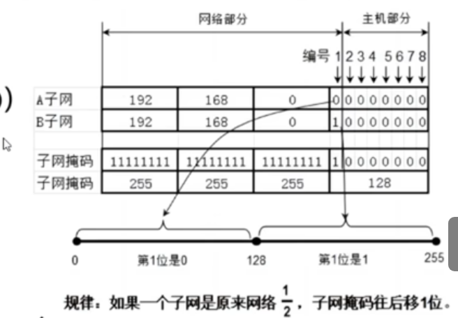 借1位,可等分成2个子网,掩码变为255.255.255.128,各子网范围: